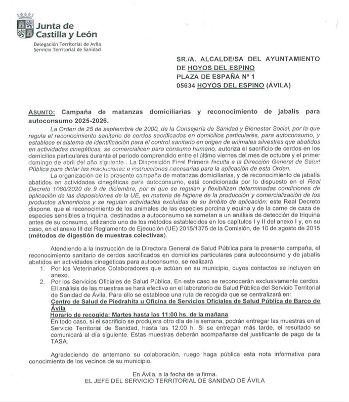 ASUNTO: Campaña de matanzas domiciliarias y reconocimiento de jabalís para autoconsumo 2025-2026.